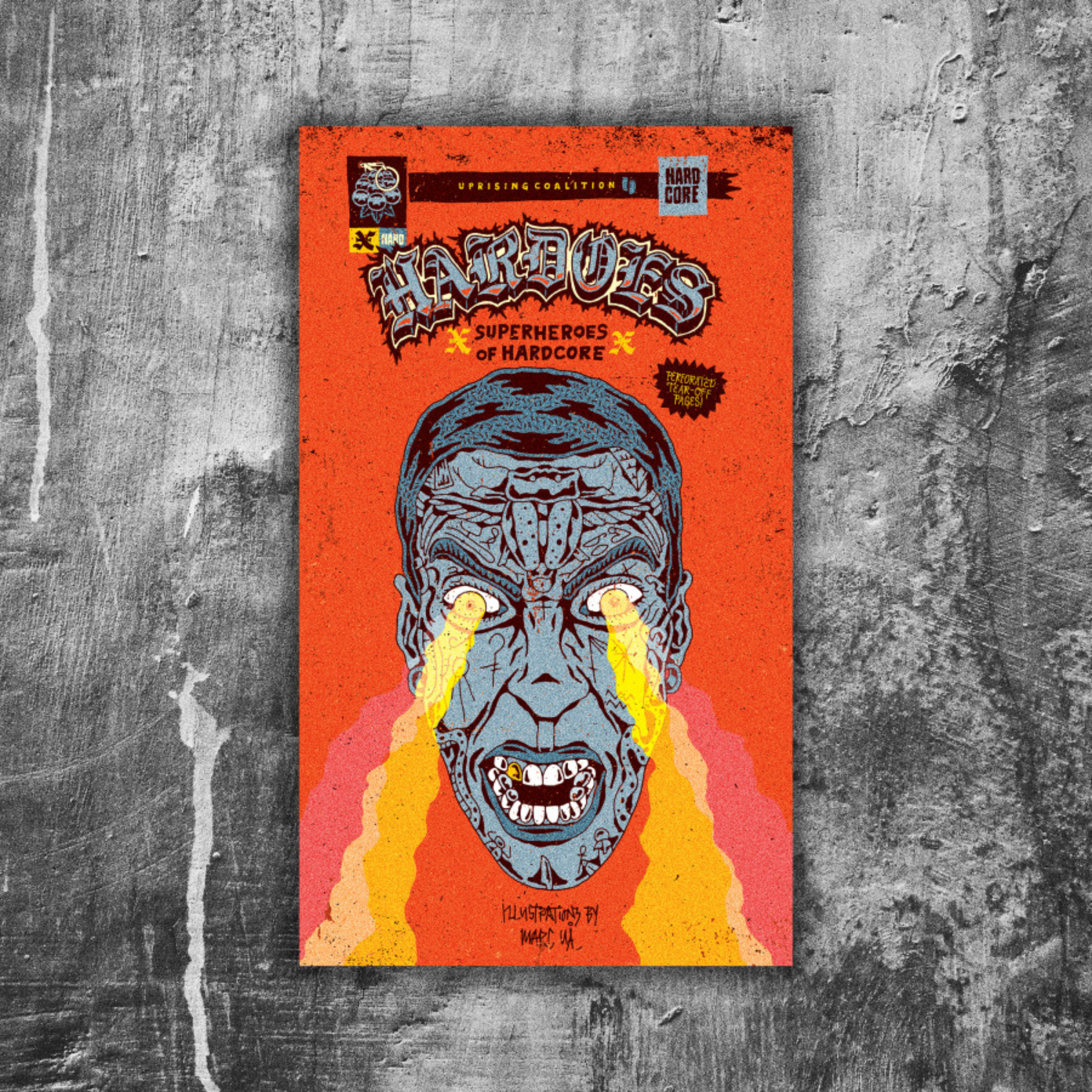 Hardoes: Superheroes of Hardcore features 109 (!) Hardcore superheroes uniquely drawn by the super talented graphics artist Marc UÅ. Marc has been into Hardcore forever, and his work has been covering record covers, shirts, soda cans and even restaurants.